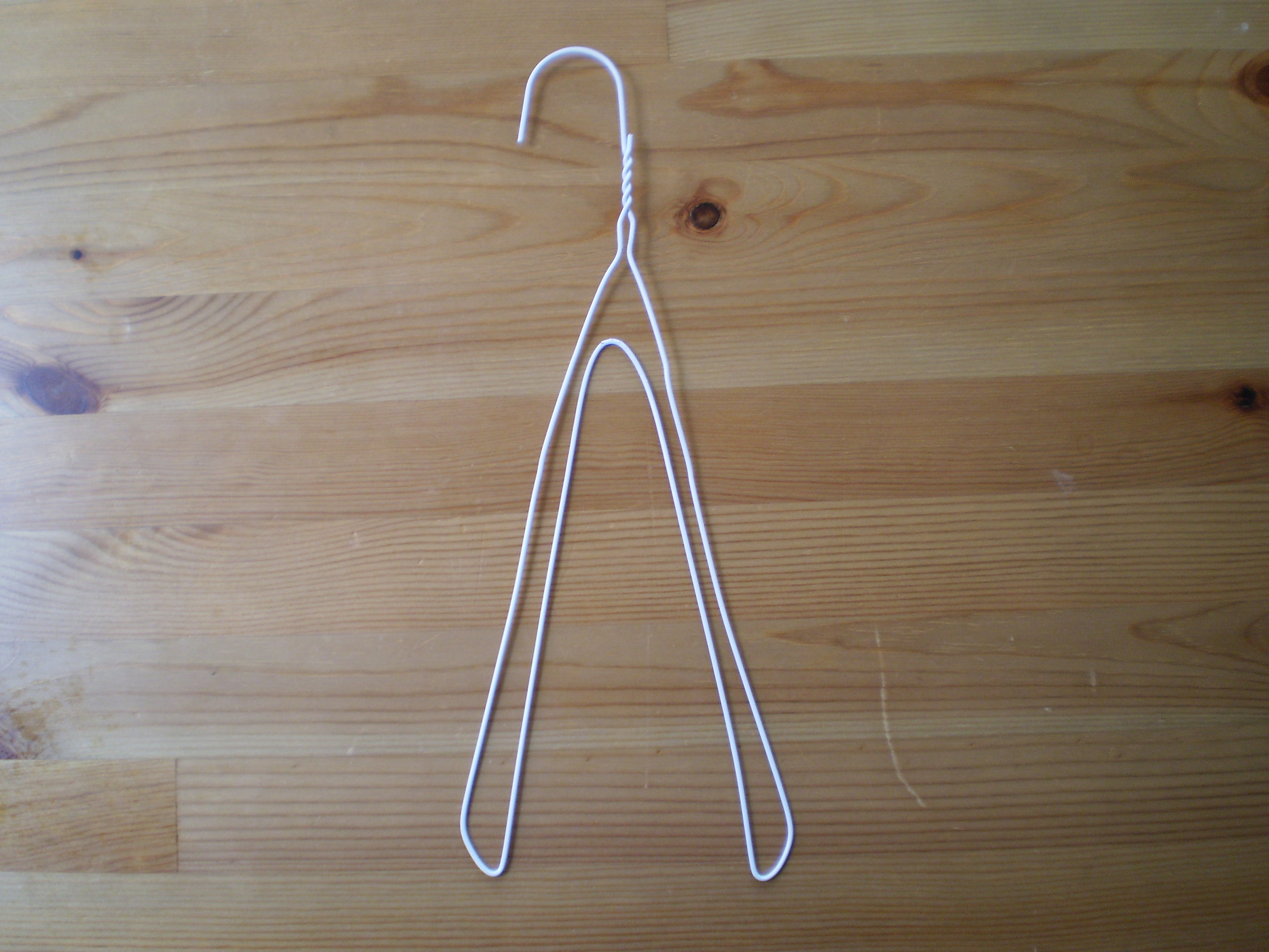 1. Bend the hanger into a V-shape, making sure that the two arms are roughly even, smoothing out the “shoulders.”