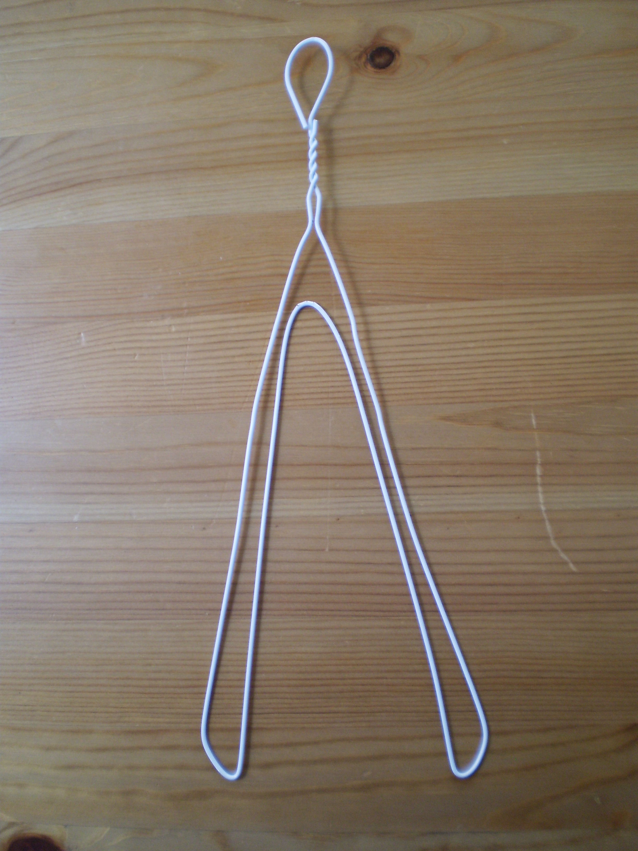 1 Wire Hanger (the cheap-o kind you get from the cleaners.  I’ve never actually taken anything to the dry cleaners, but I still have about a million of these hangers at my house.  I think they multiply when I’m not looking)