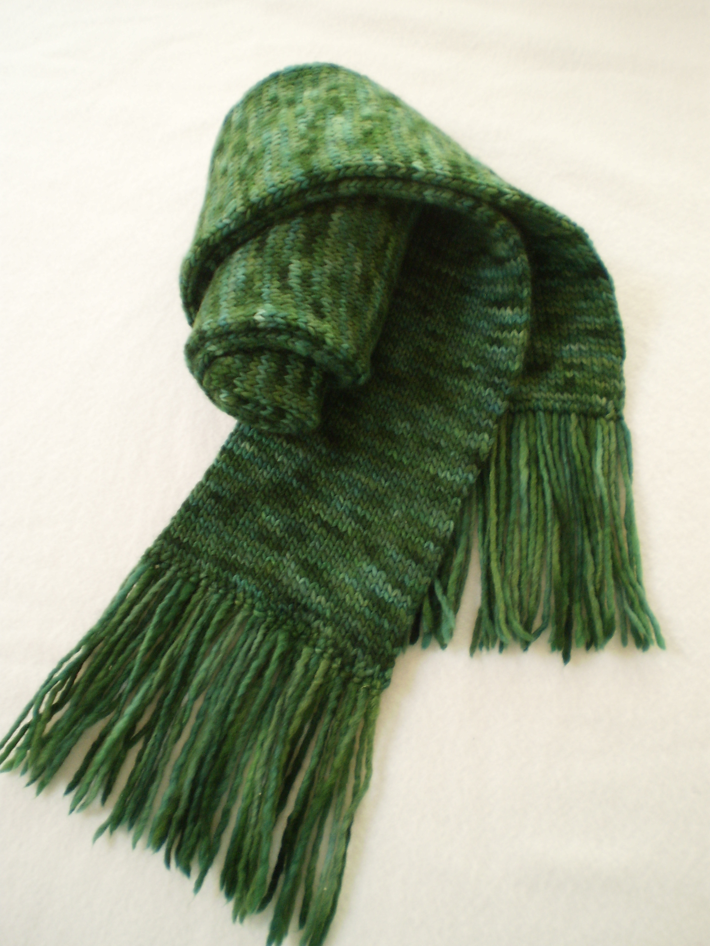 The scarf is actually knit in the round, as one very long, thin tube, like a small sleeve.  Because of this, you’ll end up with a double-thick, non-rolling, smooth stockinet scarf.  The only problem with this construction is that it can get a tad boring, so make sure you have something good queued up on your Netflix.