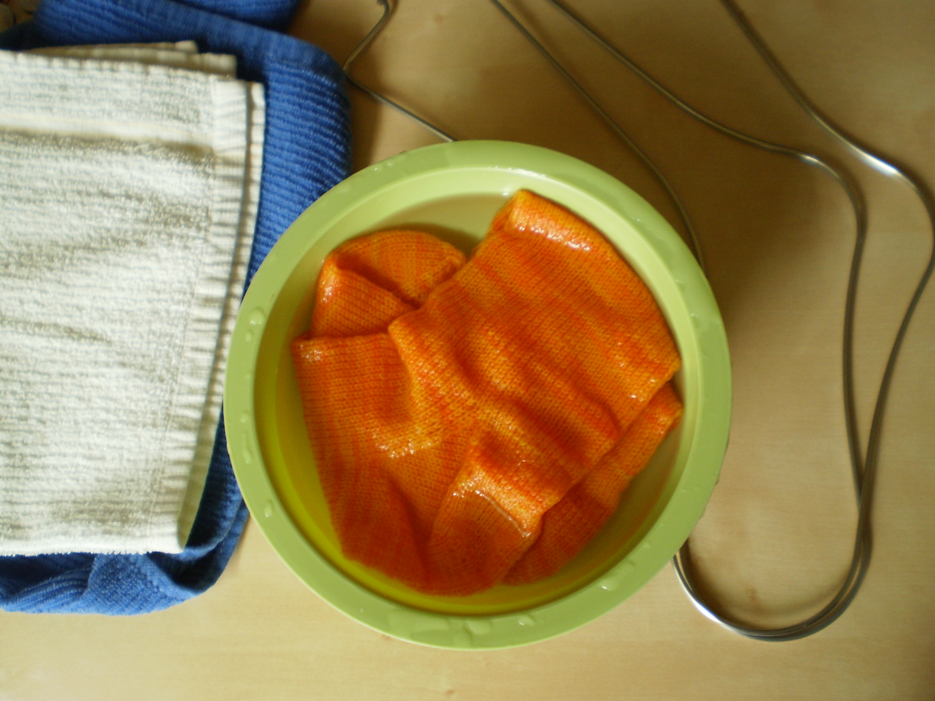 Drop your socks into the bowl of water, and let them soak for about 20 minutes. They need to be completely saturated. Don’t scrub or squeeze them or anything, just lay them nicely in the bowl of water. If you mess with them too much, they’ll start to felt, which is not ideal. You can poke them a bit until they go underwater, if you feel it’s necessary.