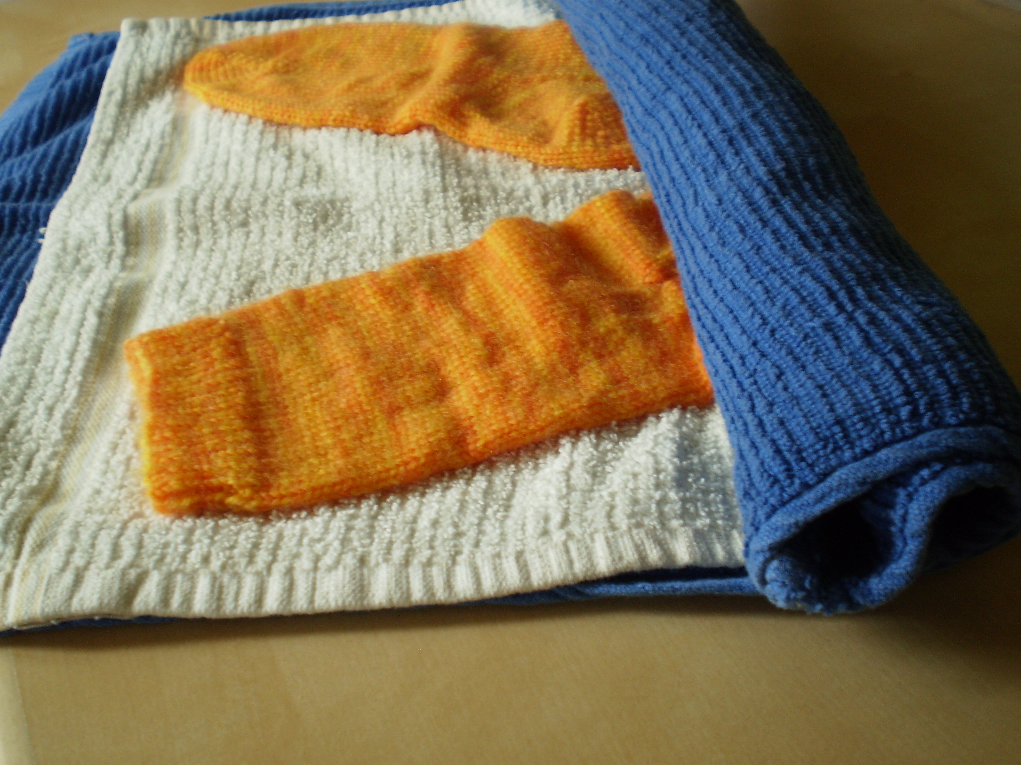 Then, lay out the towel (or towels) and arrange your socks nicely on top. Roll the whole mess into a damp towel-and-sock burrito. Squeeze it as much as you can, to get out most of the water. (I know, first I tell you to get them wet, then I tell you to dry them out… I can’t make up my mind. I’m terrible.)