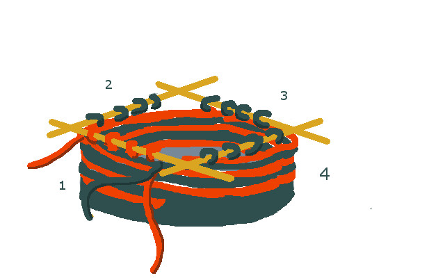 6. See how the pattern is going? You knit two needles of the first color, then two needles of the second color. This way you keep building up a spiral of stripes, until you end up with a great big long spirally/striped scarf/hat/mitten etc.