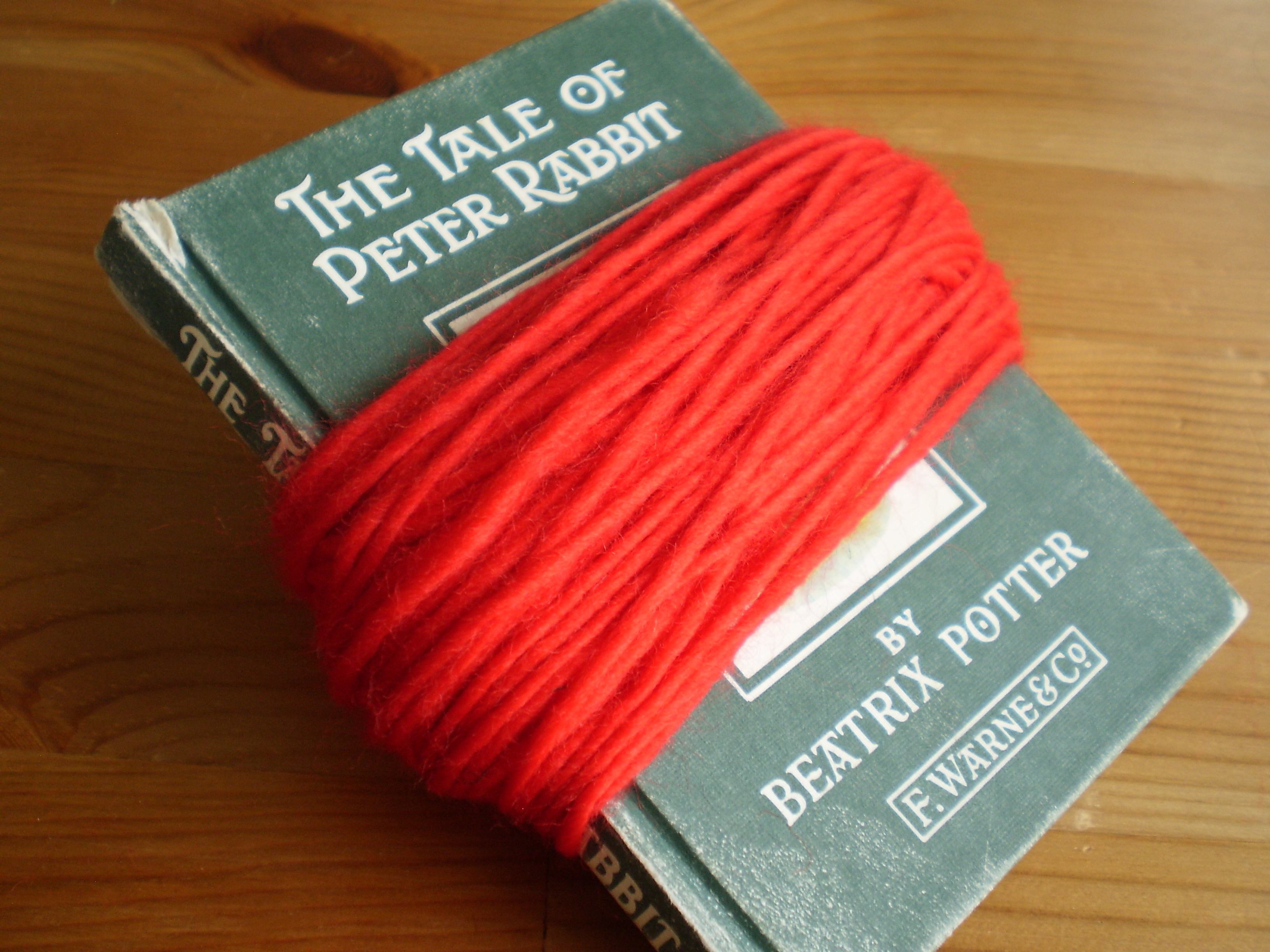 A book, coaster, cell phone, box or other small, rigid object that you can wrap yarn around. The object should be slightly longer than the desired diameter of the finished pompon. I’m using a tiny copy of Peter Rabbit that I have on my bookshelf for some reason. It’s about 4 inches wide.