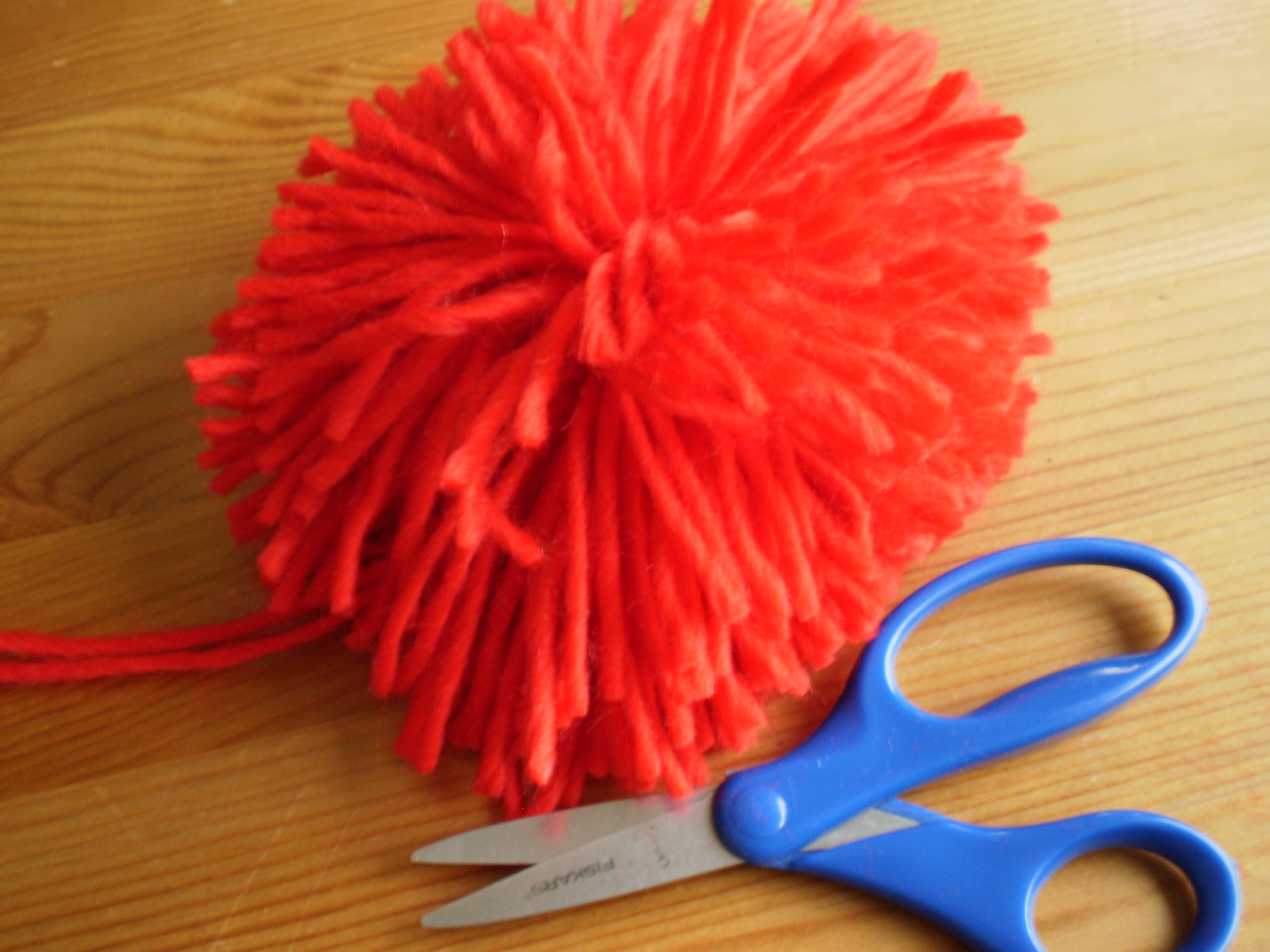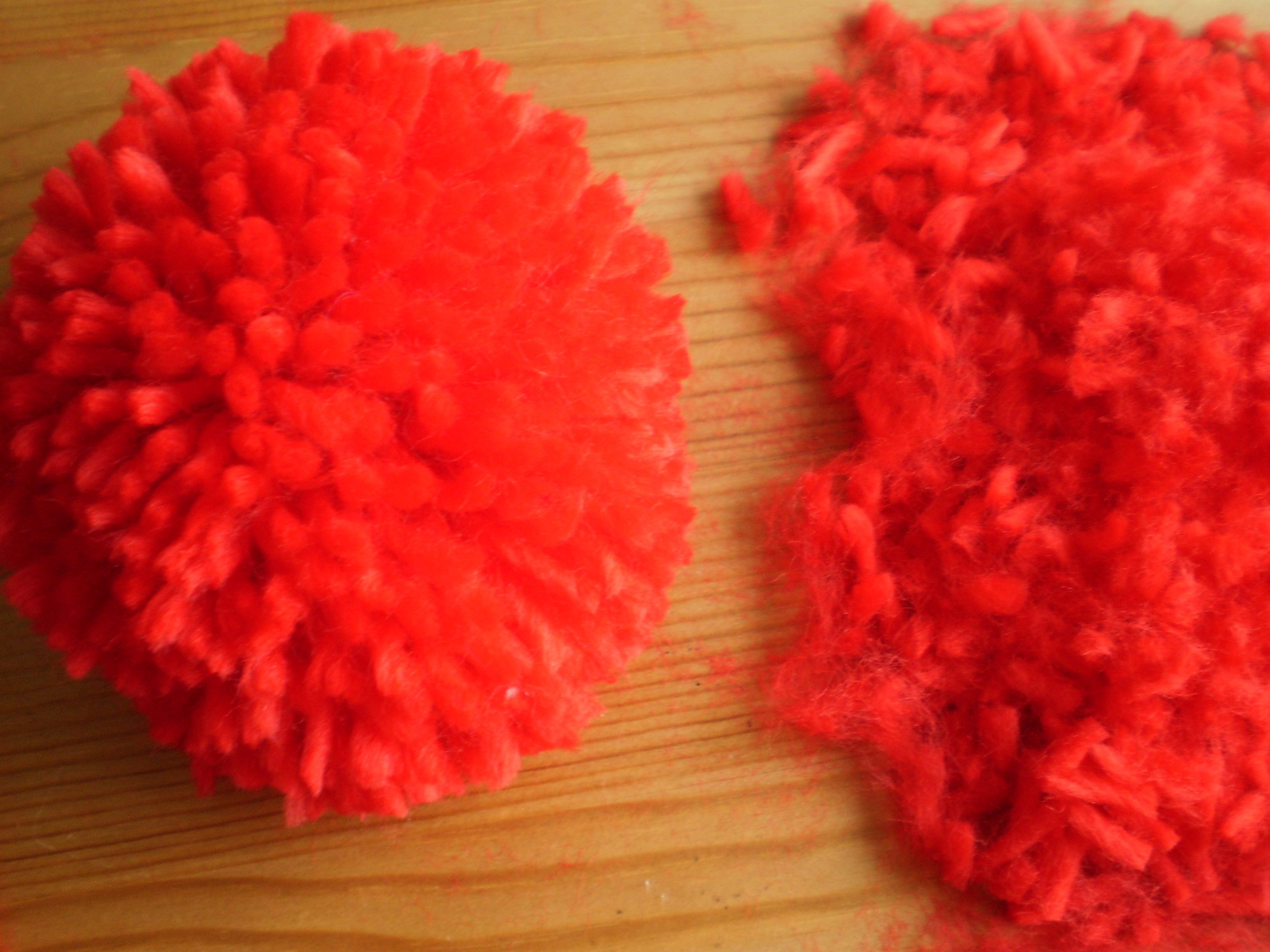 Pompoms are easy to do, but probably the messiest project you’ll ever do involving yarn…the little scraps of yarn tend to go everywhere and stick to things if you’re not careful (that static cling will get you every time). You have been warned.