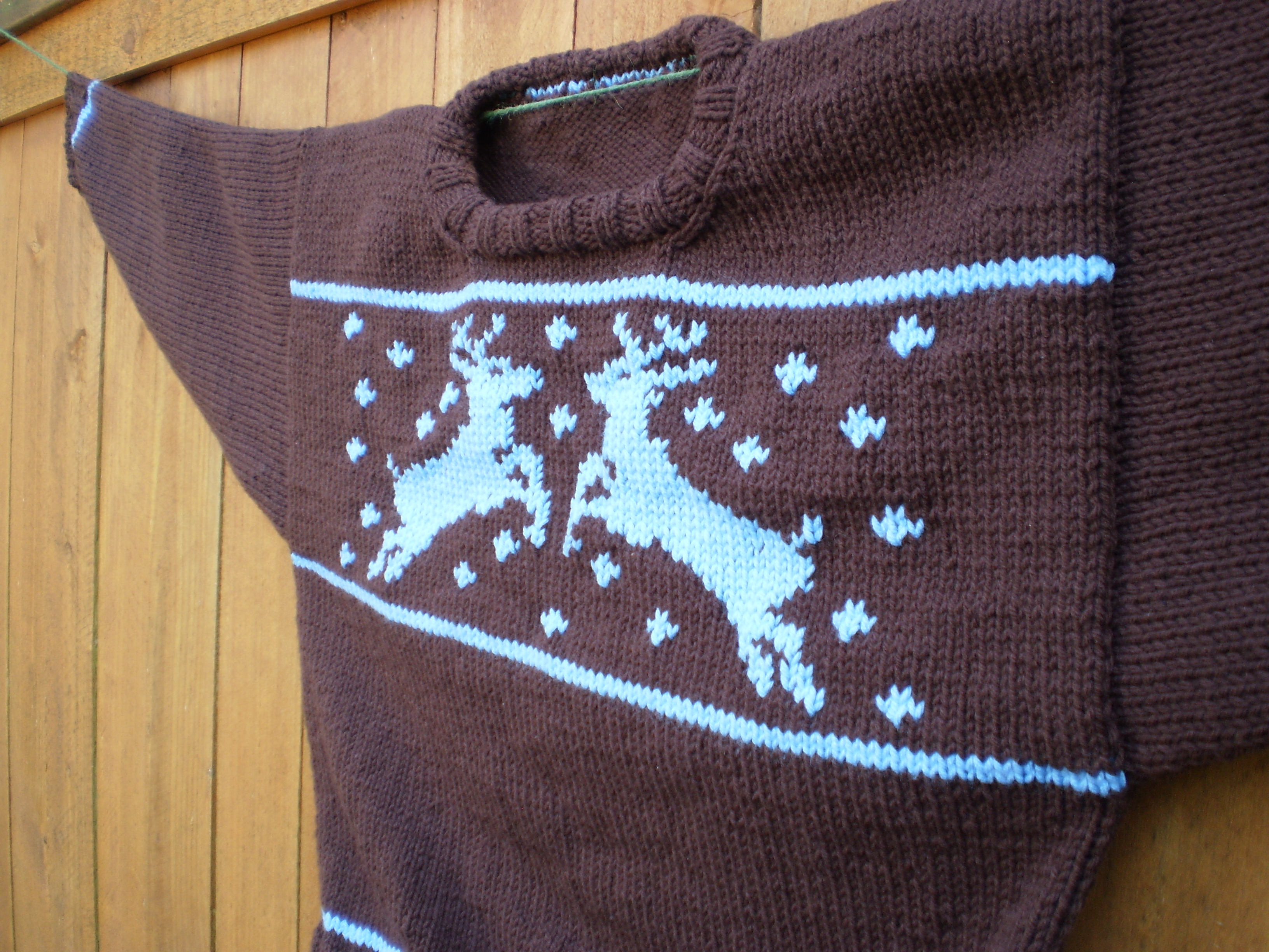 My next problem was the deer motif that I had to put on the chest. I looked at a lot of patterns, and finally decided to use the deer motif from the His & Hers Reindeer Jackets from Patons. I originally planned to work the deer using the intarsia technique, but then I decided that I wasn’t insane. (Intarsia and I don’t get along very well.)