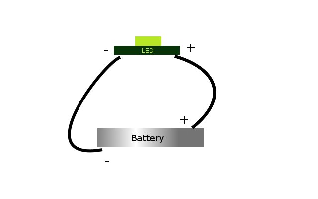 Let’s use two “wires” (pieces of conductive thread) to attach the battery to the LED, like this:Circuit 1