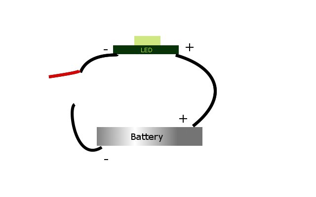 See how the + side of the battery is attached to the + end of the LED? And the – side of the battery is attached to the – end of the LED? That’ll make sure that the LED will light up.