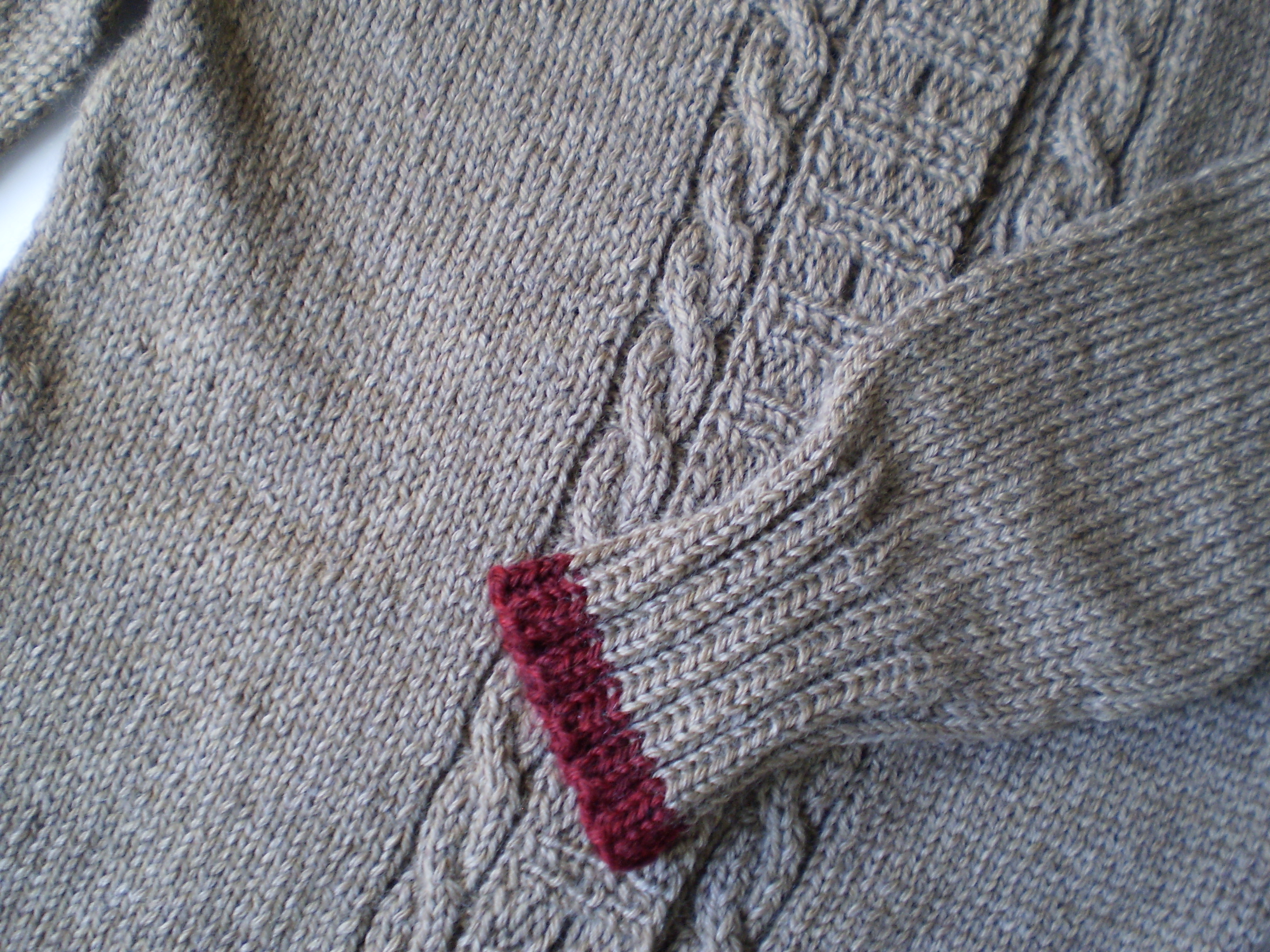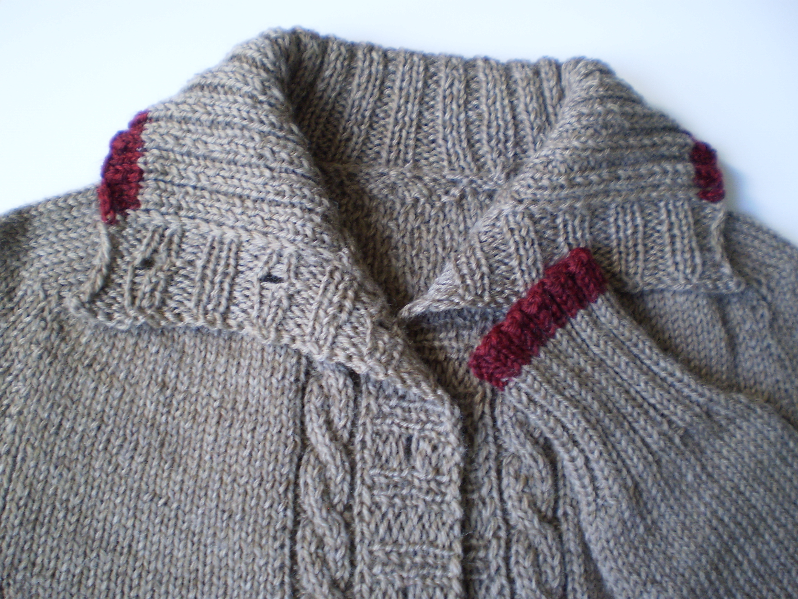 And I’m really happy with the little touches of garnet-colored yarn that I added to the cast-off edges (collar, cuffs and hem). I think the added color really make the sweater special.