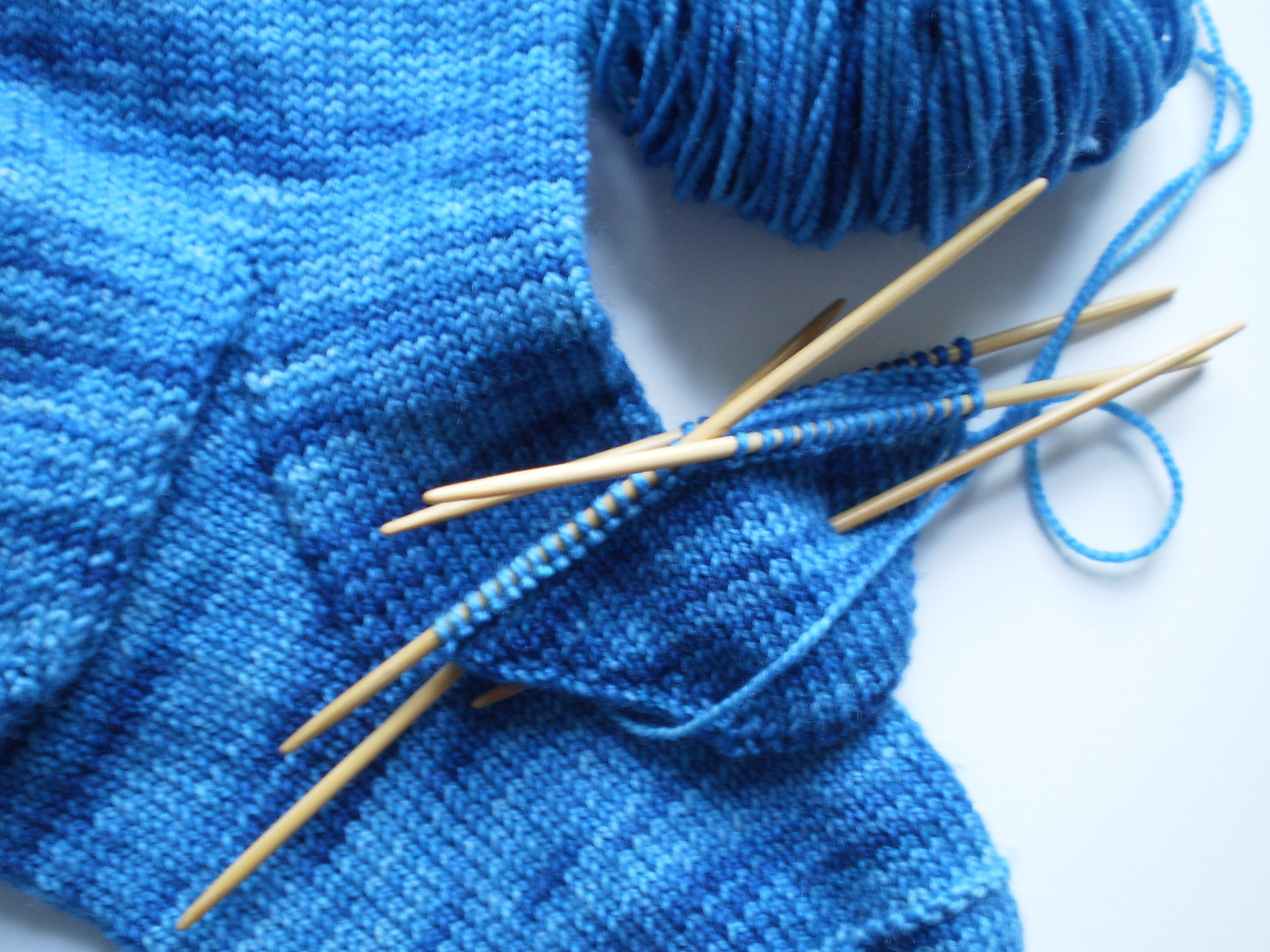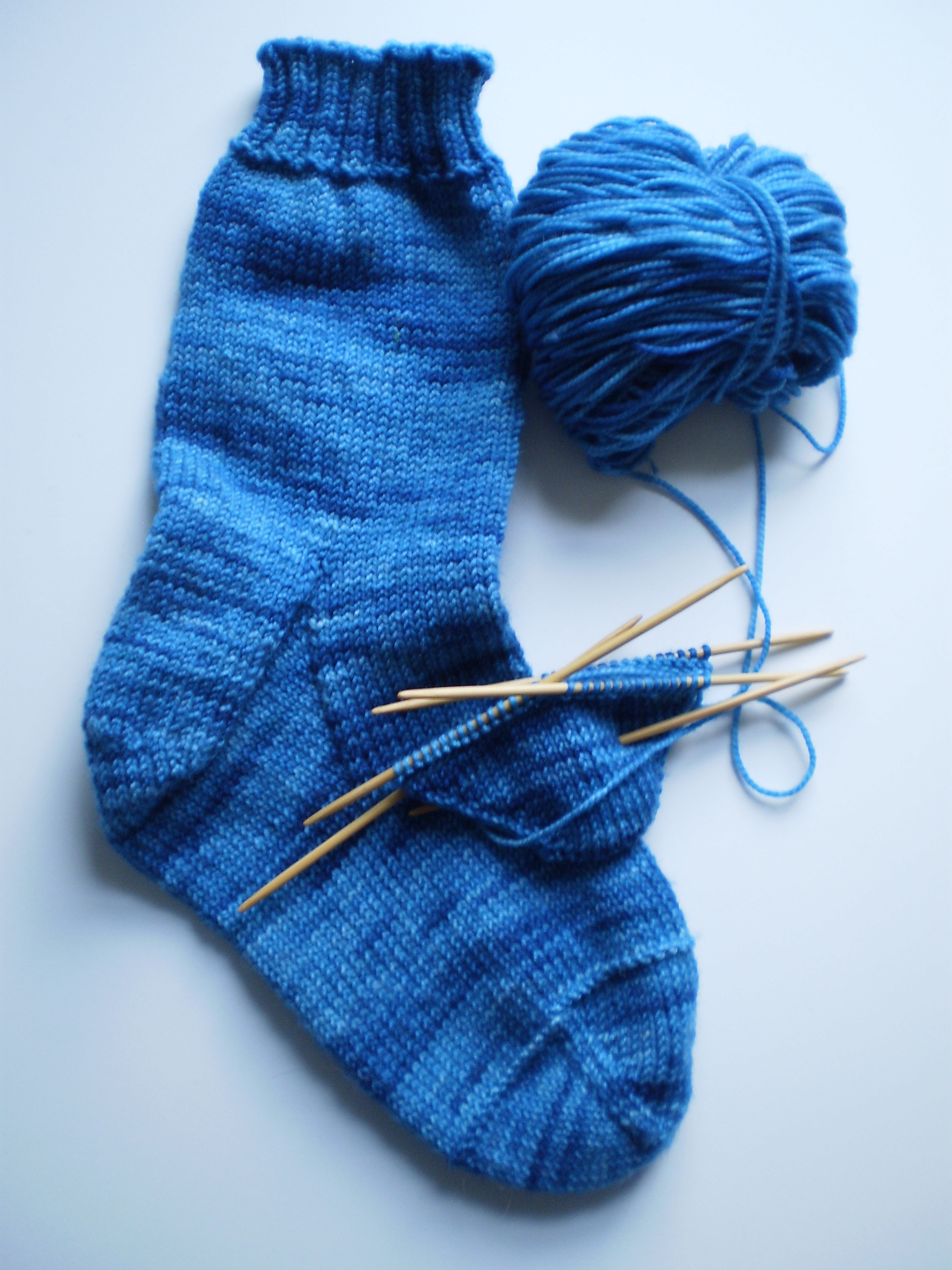 One sock, perfectly completed (in less than a week, mind you). Bound off, ends woven in, ready for blocking. Look at that lovely shade of hand-dyed blue. The yarn is beautiful and squishy. It’s delightful! And I’ve already done the toe on the second sock. The fiddly part is done. Now I just need to knit.