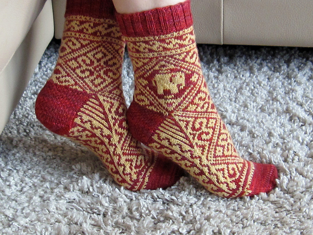 House Lannister is all about the trappings of wealth and decadence. So, whatever I made for them would have lots of excessive color-work, beads, or cables. These opulent red-and-gold socks would be perfect for a Lannister!