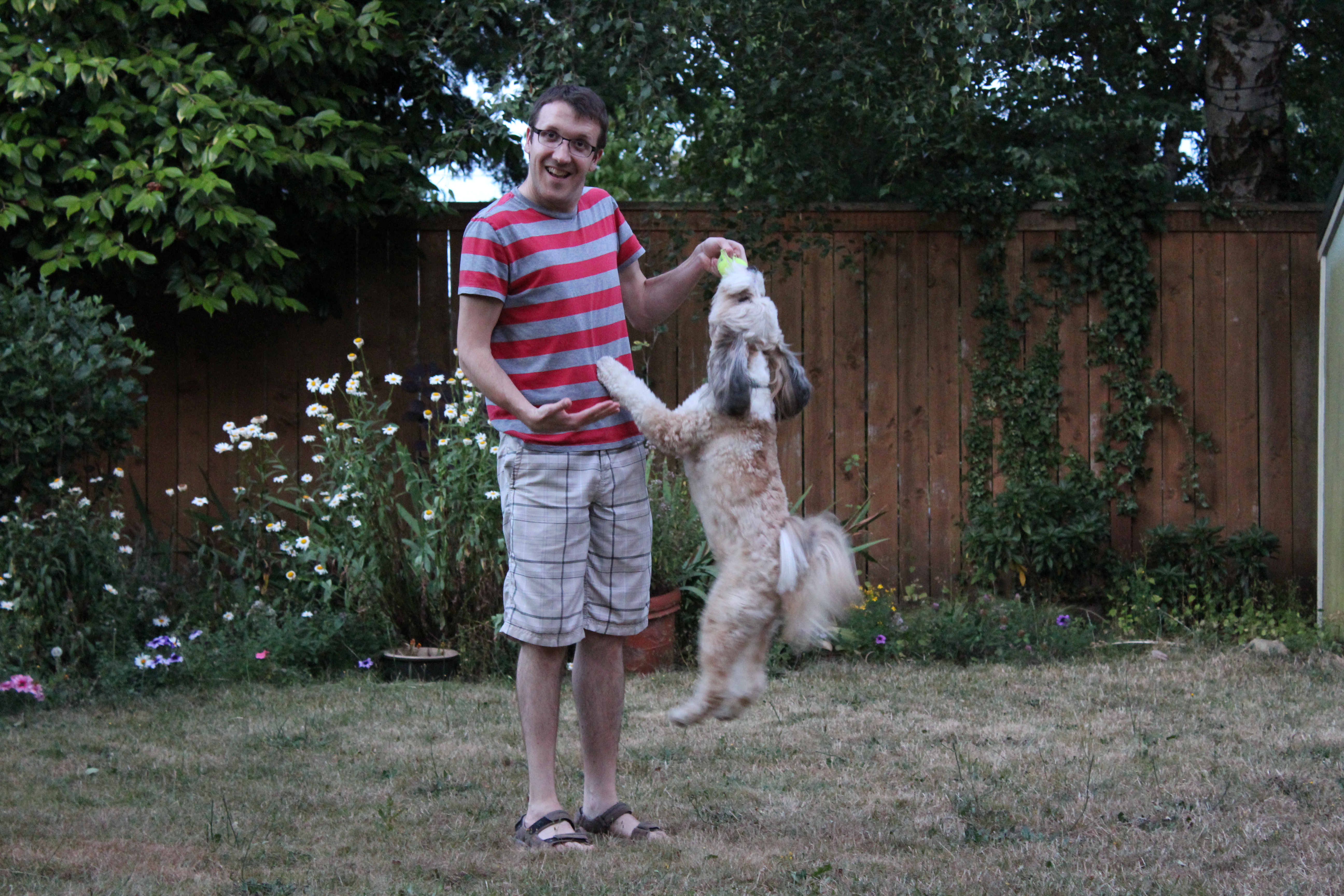 First, I’m thankful for my husband. He’s the nicest guy I’ve ever known, and he can always make me laugh. He puts up with all the Law and Order marathons and my near-constant panic about my most recent knitting project that is never going to get finished. (Don’t worry about the dog- he’s having fun. This is how he plays fetch- he never ever wants to give up the ball.)