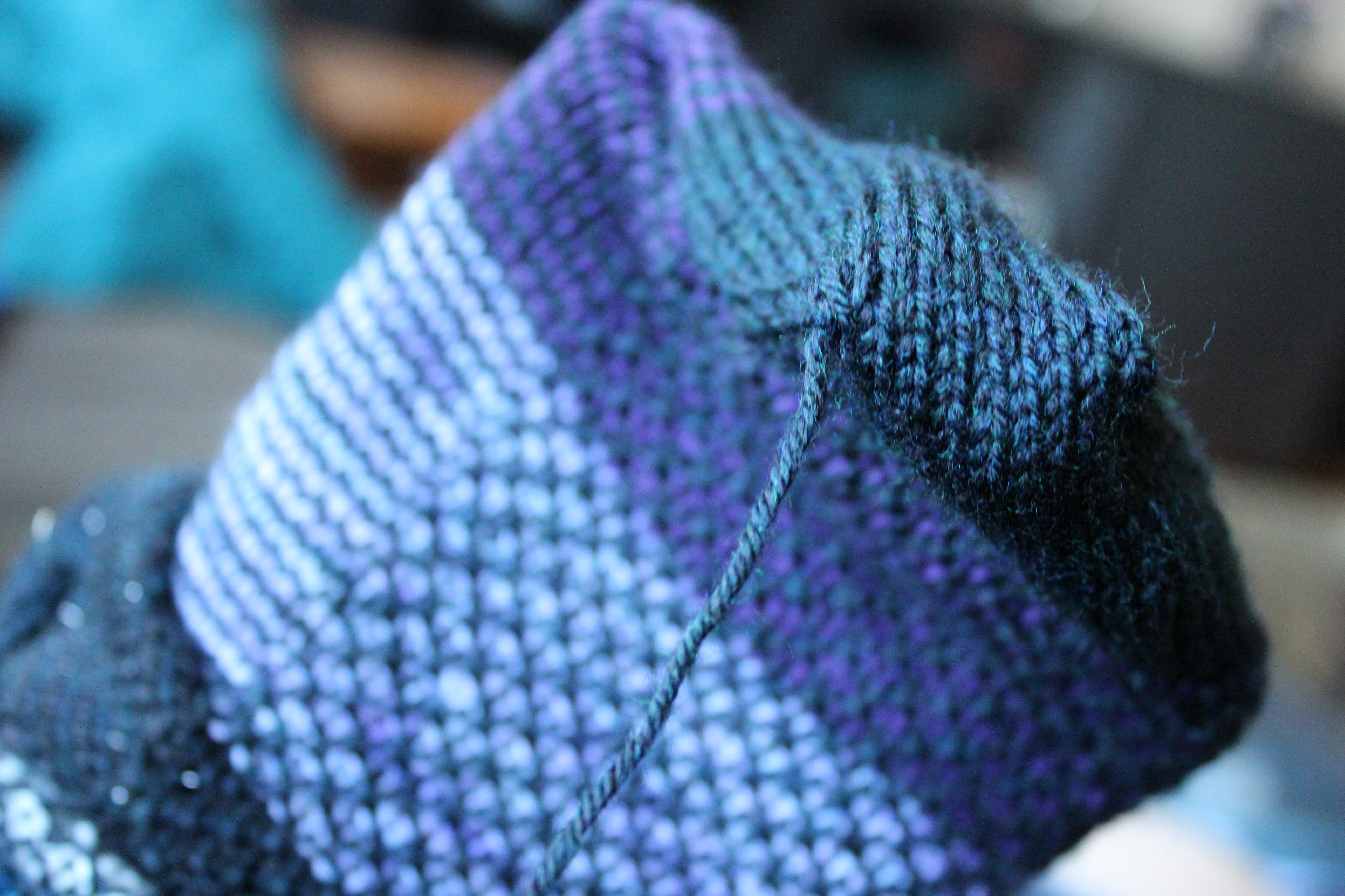 Then a little careful pulling, (I know you’re supposed to keep your stitches tight when you do the Kitchener stitch, but for whatever reason, leaving them loose, then tightening them up afterward makes more sense to me.)