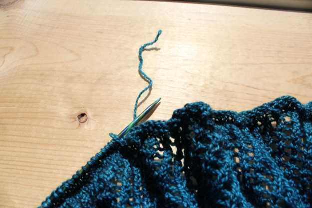 Of course, I underestimated the sheer length of the rows on this thing… That’s the worst part about making half-circle shawls. They start all cute and fun, only a handful of stitches each row, then before you know it: BAM! 400 stitches per row. You can never budget enough yarn for that!