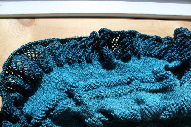 I decided that before I started in earnest on my Papaya Sweater, I’d finish off my Moon River Shawl. After all, I only have to bind off, block it and I’d be done!