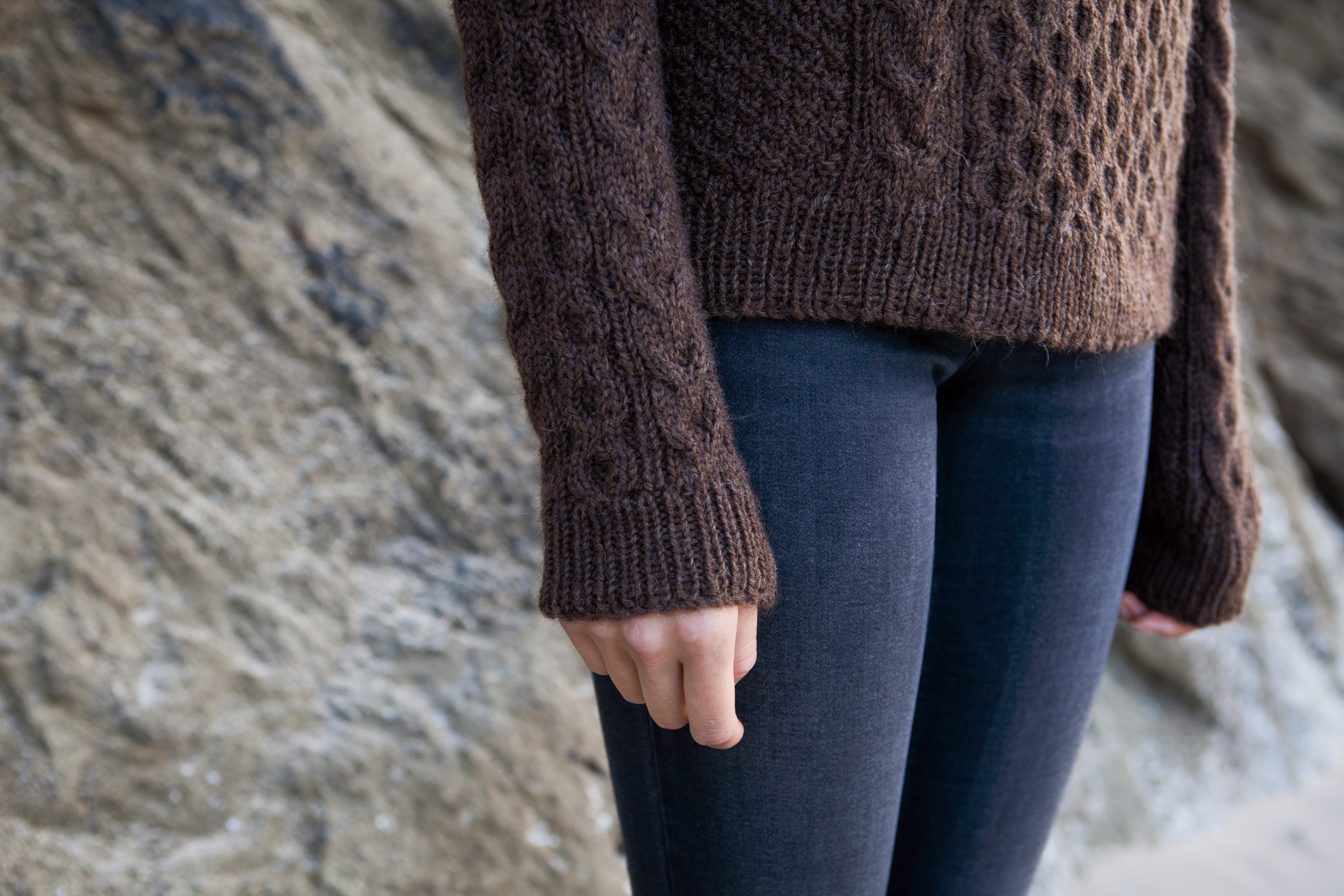 It’s a bottom-up, seamless, fully cabled-and-textured pullover. I absolutely love this design (if I say so myself). It features a wide panel of all-over cabling on the front and back, bordered with double-twist cables on either side and a cozy knit/purl background. Plus, there are matching cables down the sleeves, too! No getting bored here!