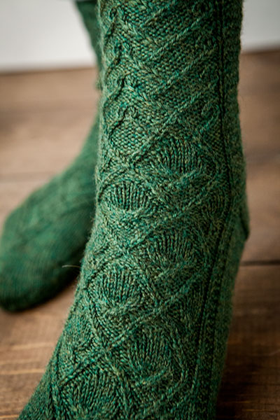 They’re a super cute, semi-girly (or at least girly compared to my usual designs), calf-length socks knit up in super-fancy Capretta (a gorgeous merino-cashmere blend from Knit Picks). They feature an asymmetrical design and mirror-image lace panels from cuff to toe. A pretty good design, if I say so myself.