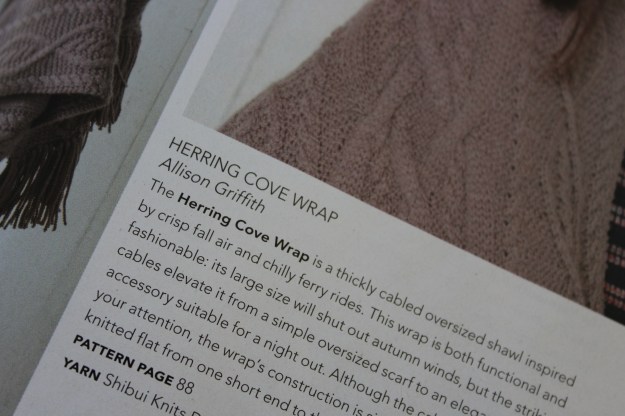 I’m almost as excited about the pattern as I am about just getting it published- The Herring Cove Wrap is a massive wrap- a gorgeous tangle of multi-strand cables. It’s not for the faint of heart, but the results are totally worth it. The example in the magazine is worked in delicious Shibui Knits Drift– an insane blend of cashmere and merino that shines like silk but feels like a cross between a kitten and a puffy white cloud. (But if you don’t have hundreds of bucks laying around to blow on yarn, any soft, squishy worsted should work well.)
