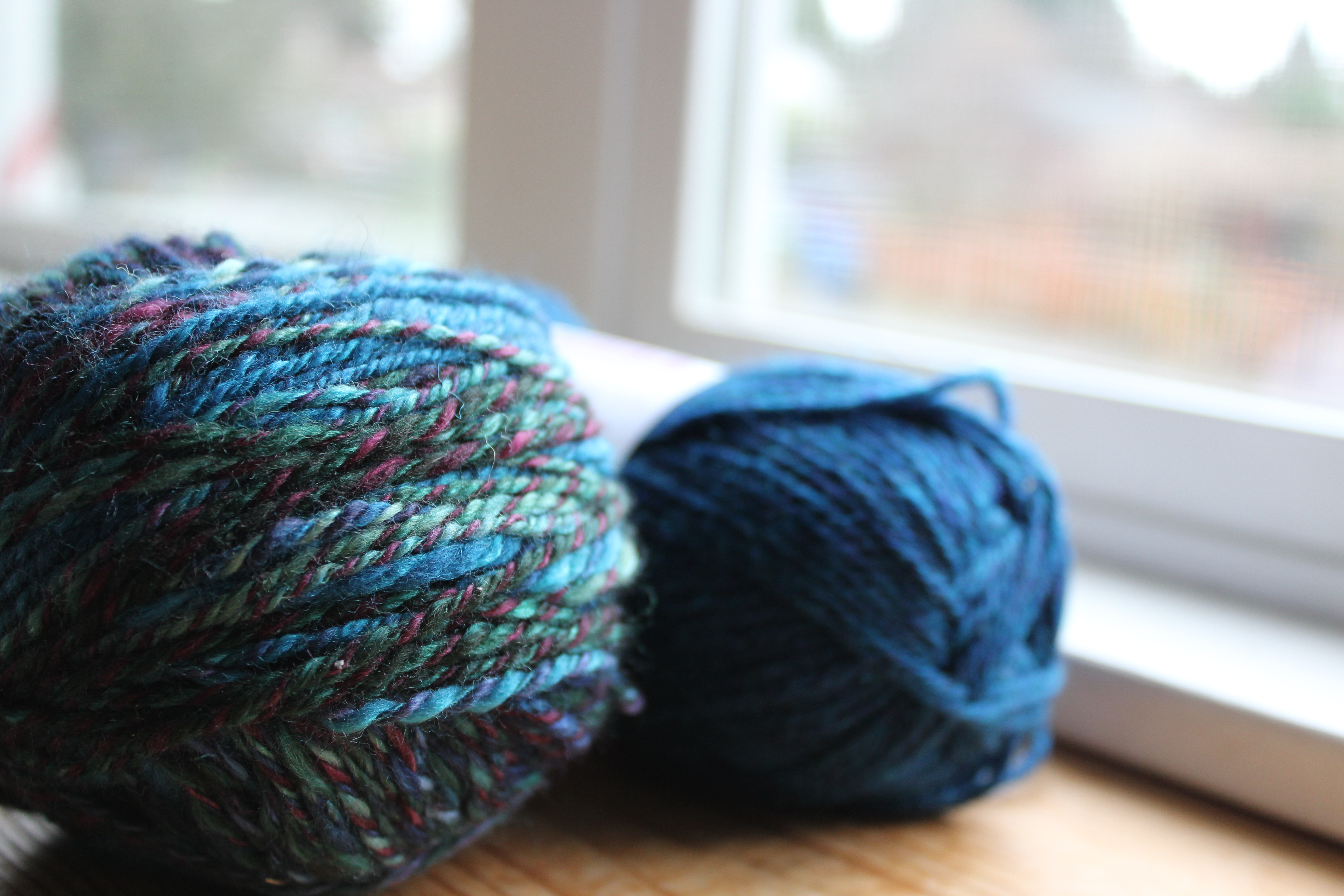 And I found a big hank of handspun that I made years ago. I don’t remember how many yards it is, it’s very inconsistent in weight (and not on purpose), and I have no memory of what the fiber content was. But it’s a very pretty blend of blues, greens and purples that I love, but is entirely impossible to photograph.