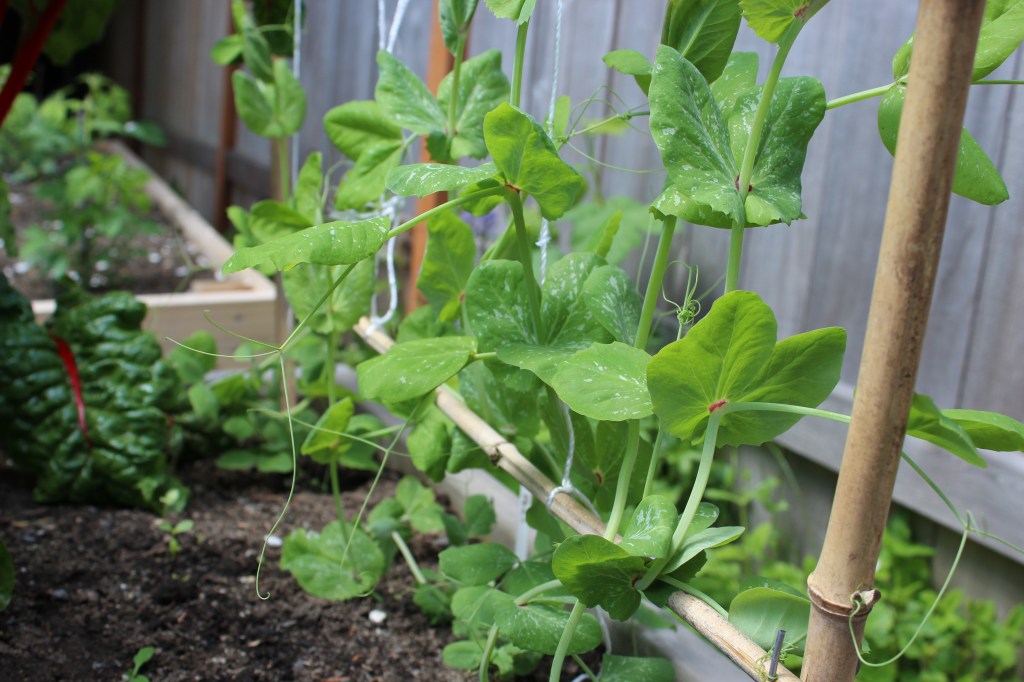 Peas! Supposedly they’re going to have bright pink flowers and purple pods!