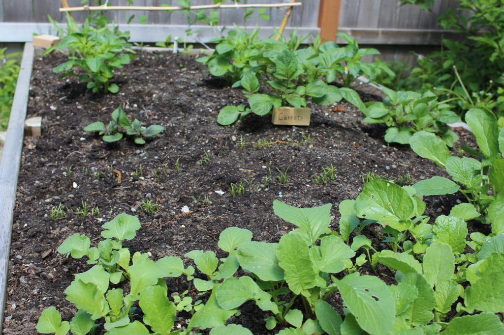One of my beds, soon to be overflowing with produce, assuming I don’t mess it up. Front to back: radishes, carrots, potatoes, kale, and sugar-snap peas.