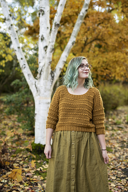 Then it hit me! I don’t want to knit a sweater, but maybe I want to… crochet? It’s been a minute since I pulled out my hooks, and I don’t think I’ve ever actually crocheted a garment (maybe some hats in high school?). I took to Ravelry to look up crochet sweater patterns, and dang! Crochet patterns have gotten cute since I last looked at them!