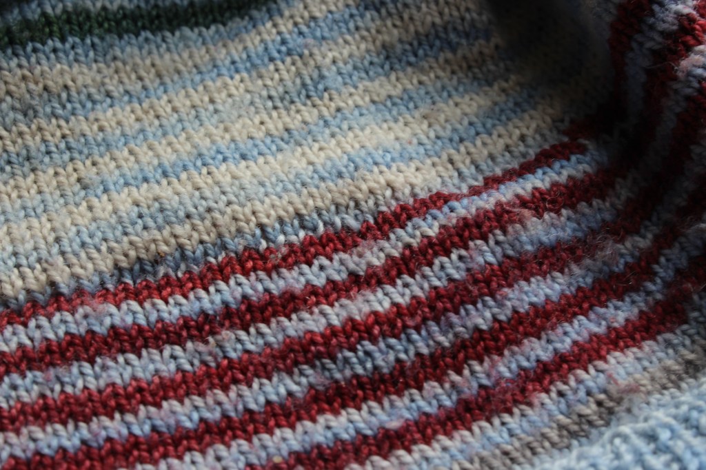 Anyway, I was sitting, chatting with them, and they were wearing the sweater inside-out (because that’s something that 4-year-olds do, I guess). They noticed the ends poking out of the sweater, and since it was a “use up all the scraps” project, there are quite a few ends. Before I could say anything, they grabbed one end, said “What’s this?” and yanked with all their might.