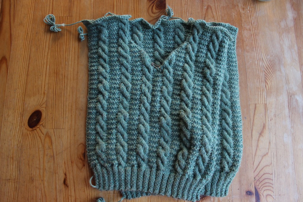 The most recent thing that I’ve winged is the V-neck for the front of the sweater. I marked the center-most stitch, then decreased 1 stitch each side of the neck, every RS row. I kept decreasing until the neck seemed wide enough (which I always have trouble estimating). It looks a little wonky because of the cables, but I think it will look OK once I add the neckband. I hope.