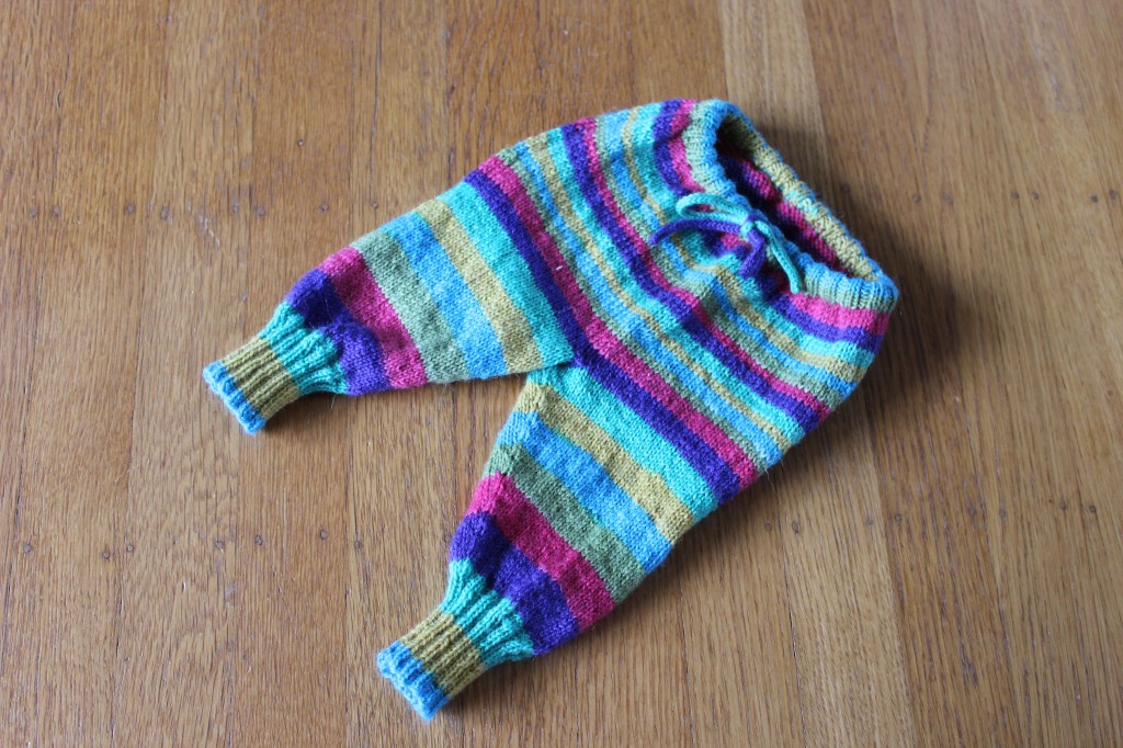 The legs are worked from the bottom up in the round, and joined at the crotch. Then, there’s a handful of short rows worked across the seat to accommodate a big ol’ fluffy diaper. They’re finished with a ribbed casing and either an I-cord drawstring (shown) or an elastic waistband.