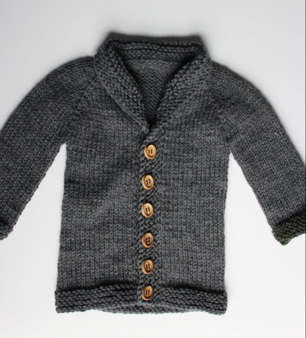 It’s done!  And I gotta say, it’s really satisfying to make a whole sweater in about a week (OK, maybe it was two, but I was dawdling).I love the little wooden buttons (that I found in my button stash!) and the Berroco Vintage is so stinking soft and cozy.  I love the little-old-man collar and the cute little raglan shoulders.I even love the fact that it the sweater has one green cuff.  I ran out of gray at the last minute, and while I could have ripped back the sweater and taken some of the length off of the bottom of the sweater (it did turn out a little long… I think… how big are babies, again?), but I wanted to keep this project as quick and easy as possible.  So, I just grabbed a little green Vintage I’ve had stashed away.  It ended up being perfect!