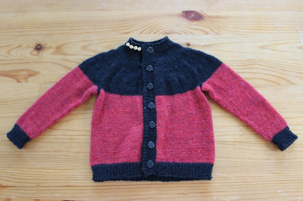 I’m doing the yoke, hem, cuffs, collar and button band in black, and the body and sleeves in red.  It’s not 100% show-accurate, but I think it gets the point across without having to fuss with intarsia or any fancy colorwork.  I think it looks pretty dang captain-y.  (And I think it’ll look even better once I add some gold buttons and little captain’s pips on the collar.)