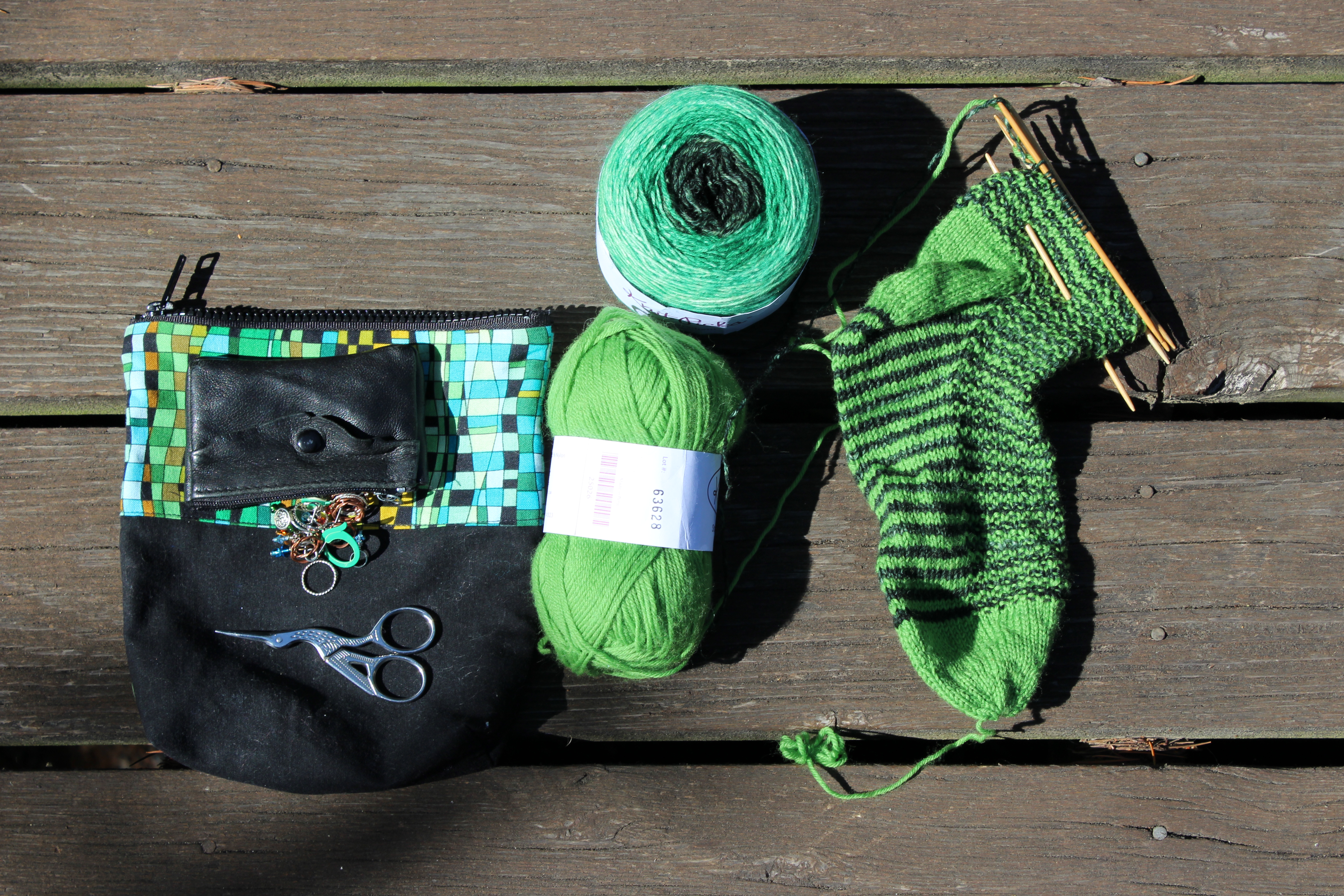 I’ve got a handful of sock bags, but I think this one might be my favorite. It’s tough- I sewed it out of poplin and scraps of cute green quilting cotton. It’s nice and roomy, but still compact enough to fit in my purse. And, it’s got a nice big zipper to keep my knitting safe and sound as I schlep it around town.