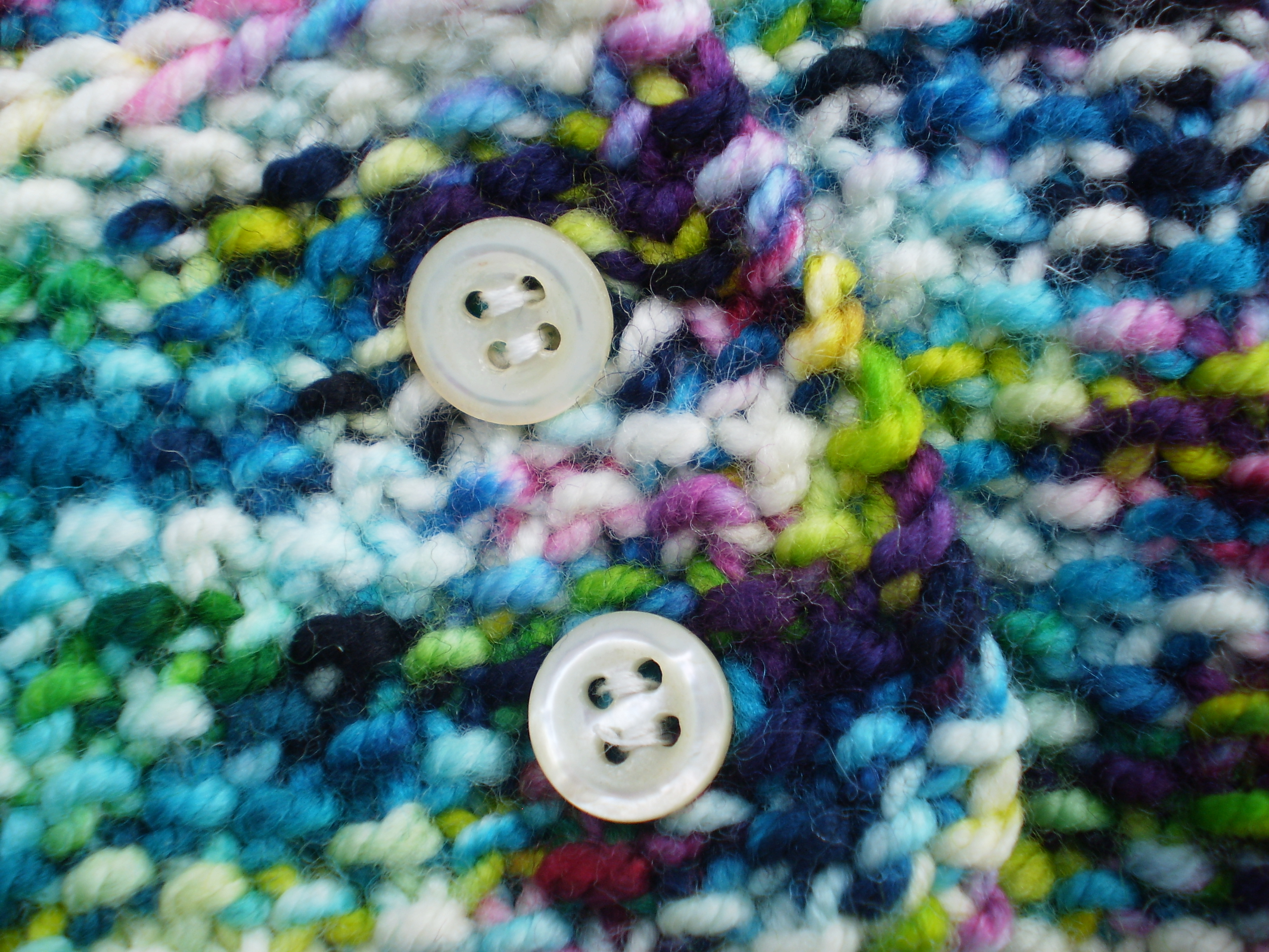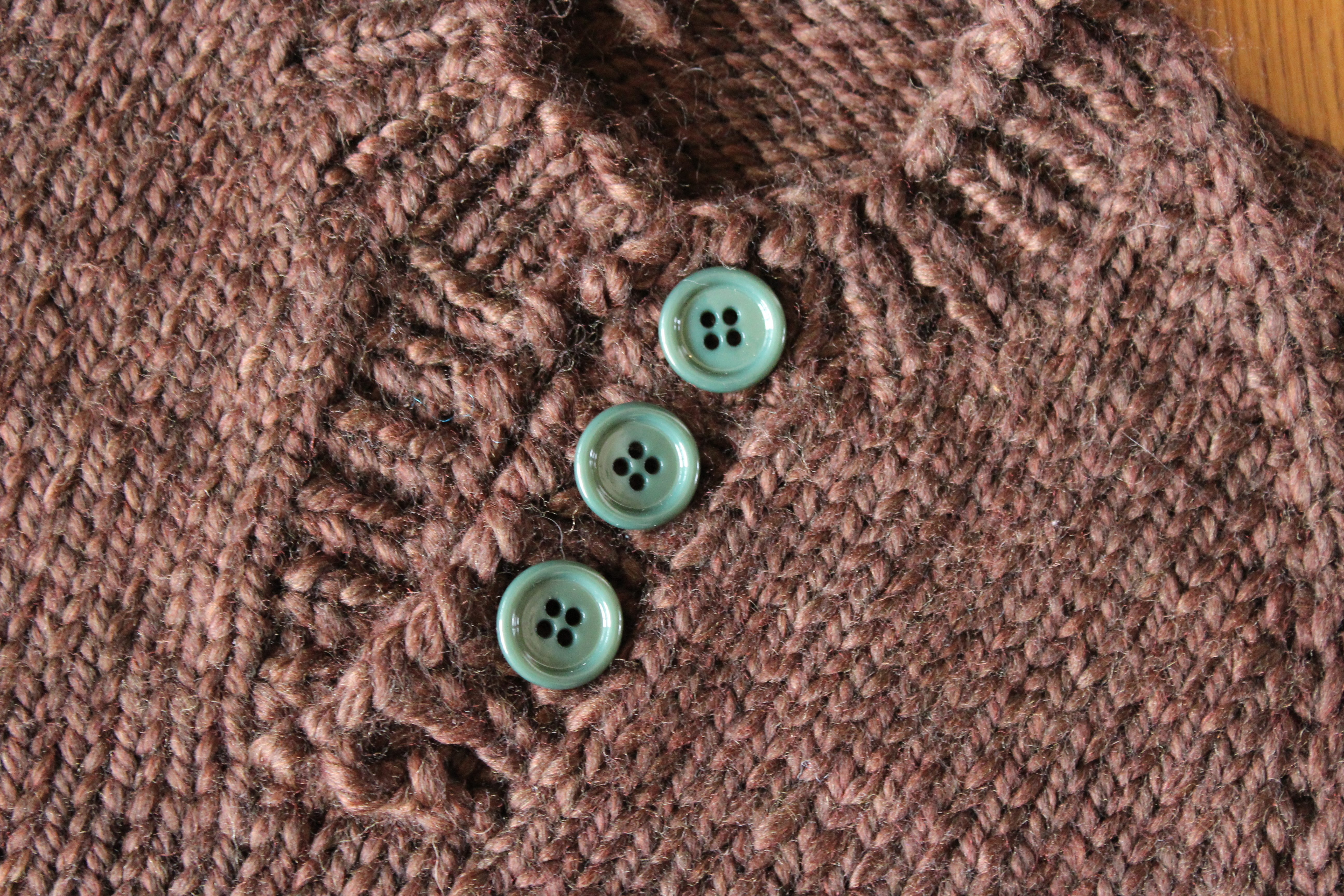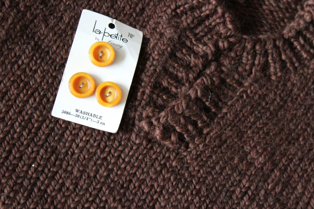 And these buttons are so cool! They look like hand-formed aluminum, or maybe tarnished silver. But, they’re actually made of plastic, which sounds lame, but is actually kind of perfect for a sweater. These buttons are so light, they won’t make the front of a cardigan droop from their weight, even though they are large and impressive. Cool, right?