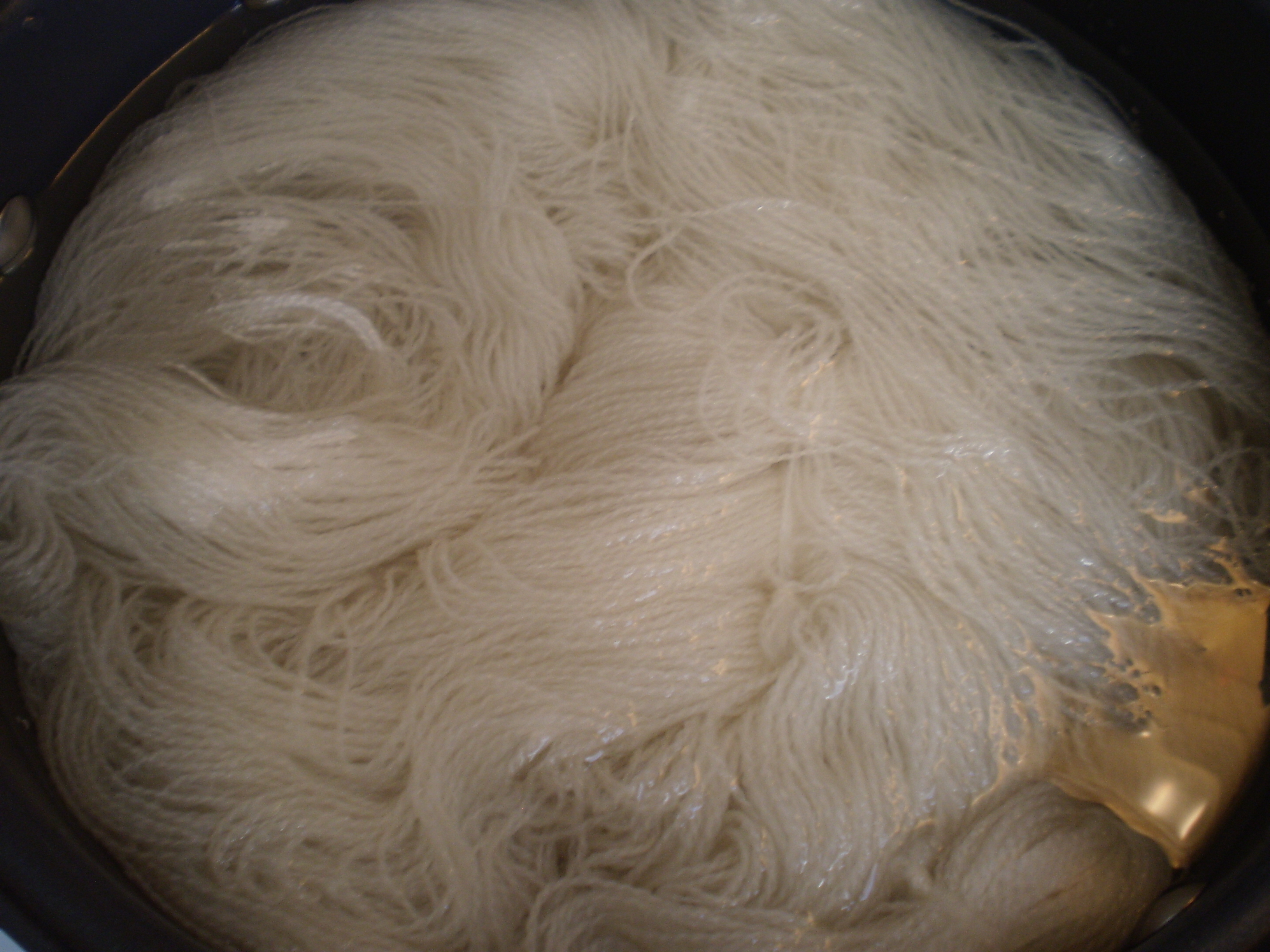 Start out by soaking your yarn in some nice warm water (like usual). When it’s thoroughly soaked, get out a big baking dish and line it with a piece of plastic wrap (mine is pink, because it’s left over from Christmas, when, apparently, you can buy pink plastic wrap). Then, arrange your yarn neatly in the dish, so that it’s all nicely laid out.
