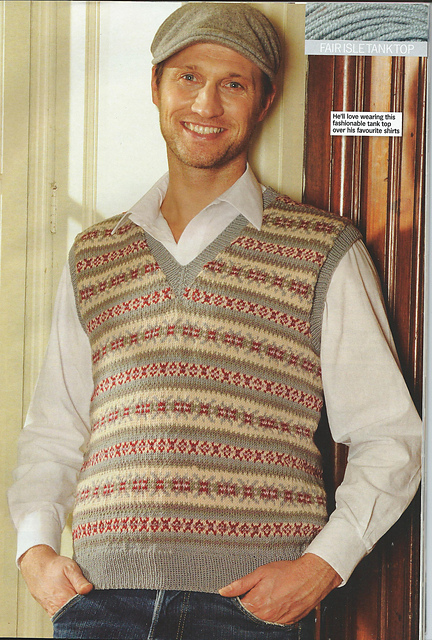 But this one might be my favorite. I like the buttons, and the use of three different fair-isle patterns across the front and back. The styling-not so much. Why would you wear a knit vest with a T-shirt and jeans? Come on.