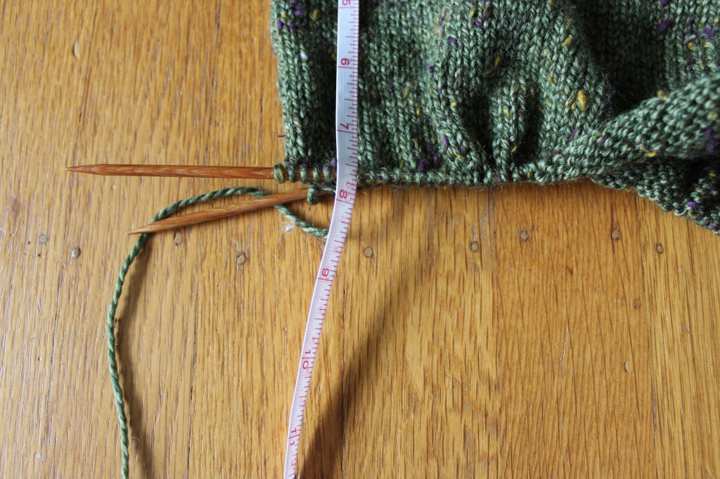 Once you have the squareish swatch, lay it out flat. People who actually are good at this stuff say to wash and block the swatch the way that you will treat the final product. That is too much effort for me. Yes, doing that will give you a more exact result, but I don’t wanna. *pout* I just give the swatch a couple tugs in either direction to make the stitches sit nicely, and lay the square out flat on a table, couch cushion, or my leg. If the swatch is being particularly squirrely and trying to roll up, I might throw a couple pins in the edges to hold it flat, but not pull it too tightly (Pin it to the couch cushion… not your leg).