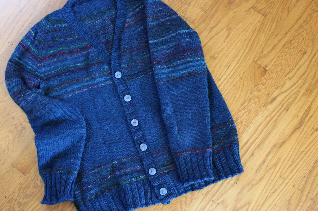 I finished the body with a whole skein of blue left over, then picked up a whole mess of stitches for the button band. (Pro tip- when picking up a button band, you pick up 2 stitches in every 3 rows as you go up the sides, then pick up 1 stitch in every stitch across the neck. Then, check to make sure the two sides are more-or-less equal and if you have the right number of stitches for the ribbing you’re doing. If one side has too many stitches, instead of ripping out and re-picking up the stitches, just work the appropriate number of decreases on that side in the next row as you establish the ribbing. And, if you need to change the number of stitches to make the ribbing come out evenly, do the same thing, but at the back of the neck. So much easier than ripping out, and no one will ever know!)