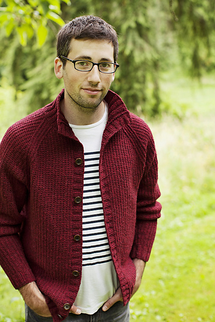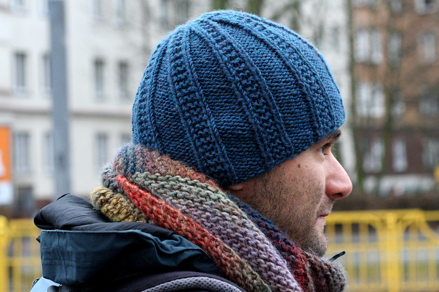 I picked up stitches from the neck, and knit even (in pattern) for about 8 inches. Then, I marked the center back of the hood and started decreasing on either side of the mark. At first I decreased every fourth round, then every other round, then right at the top of the head, I decreased every round. Finally, I grafted the hood together at the top of the head to make a seamless-looking hood that fits my husband (almost) perfectly.