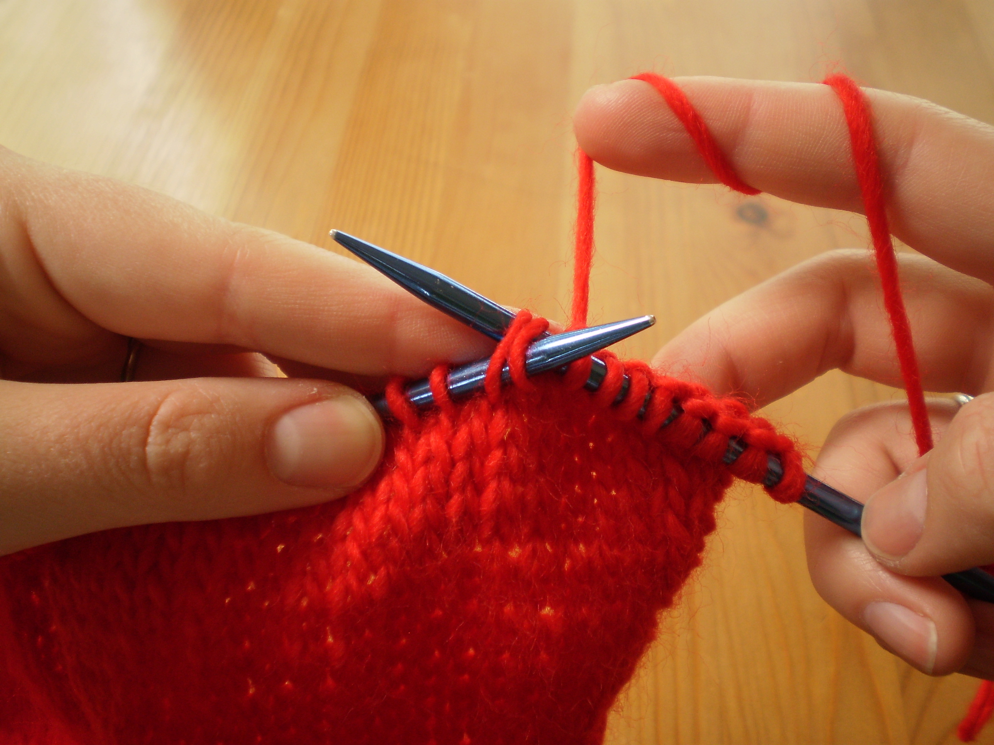 OLYMPUS DIGITAL CAMERAPull that new loop carefully through the old stitch.  This is tricky at first, so keep trying.  If you keep a little tension on your yarn, it makes it easier.  I like to wrap the yarn around my index finger to help keep tension, but if you don’t like that, try holding the yarn between your index an thumb, or wrapping it around your whole hand.  Every knitter holds their yarn a little differently. Find what feels good to you.