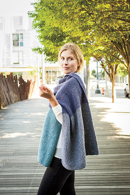 This wrap is essentially a massive scarf, worked in seed stitch with extra-bulky yarn. (It’s super easy and goes super fast!) I love the colorblocking- the big swathes of each color are modern and un-fussy.
