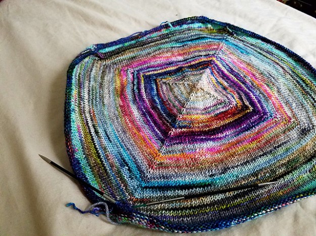 And, if we’re talking color-mixing and using up scraps, we can’t not talk about Stephen West. This sweater asks for bulky, or DK, or sport, or worsted, or lace-weight yarn and would lend itself to using just about as many colors as you want or have. Perfect for end-of-the-world stash-busting!
